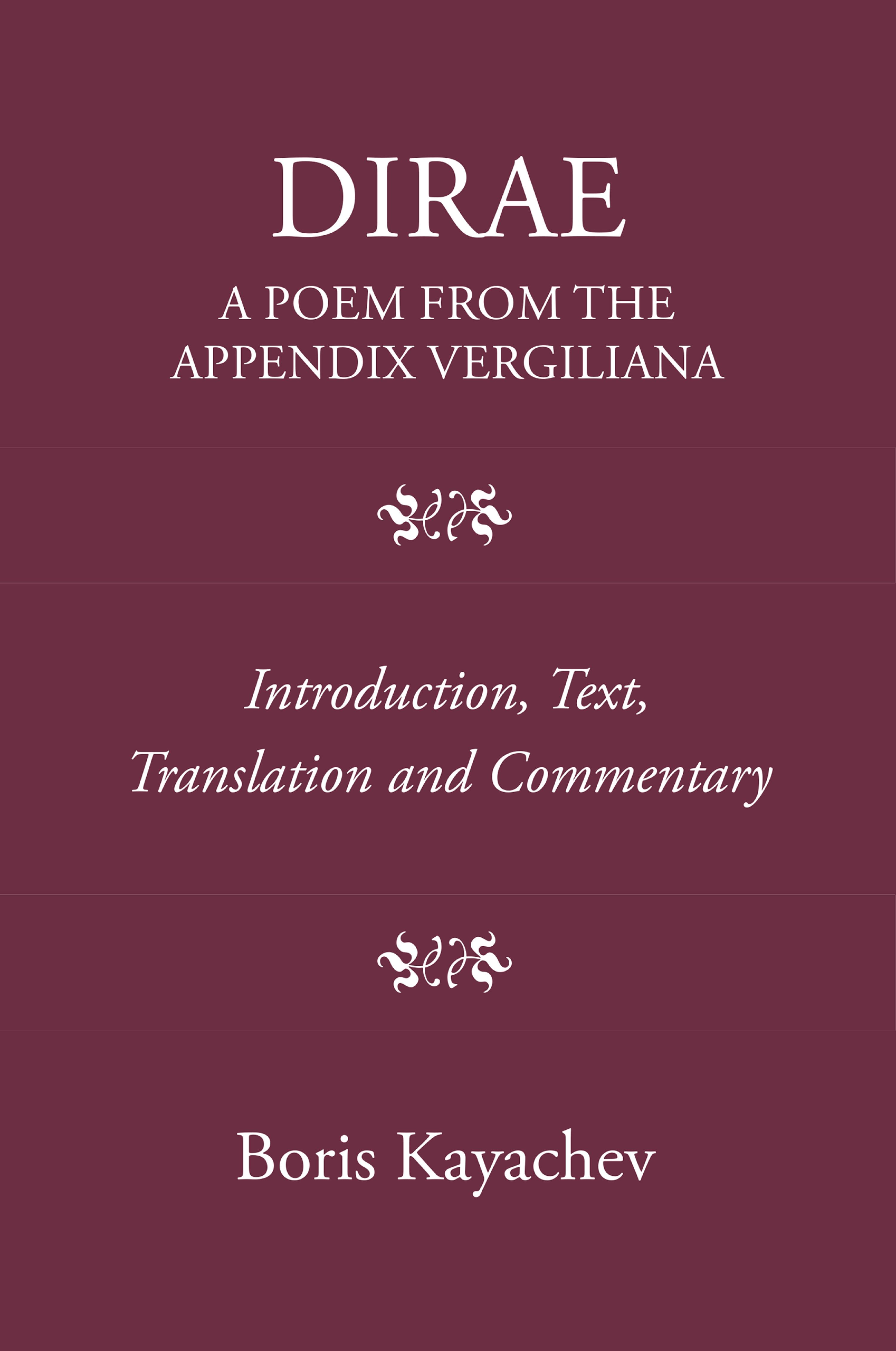 Boris Kayachev is a Research Fellow at Trinity College, Dublin. His main interests lie in the literary, textual and linguistic exegesis of Latin poetry, in particular of the Appendix Vergiliana. He has published books on the Ciris (Allusion and Allegory: Studies in the Ciris, De Gruyter, 2016; Ciris, a Poem from the Appendix Vergiliana, Classical Press of Wales, 2020), the Lydia (Lydia, a Poem from the Appendix Vergiliana, OUP, 2023), and now the Dirae.