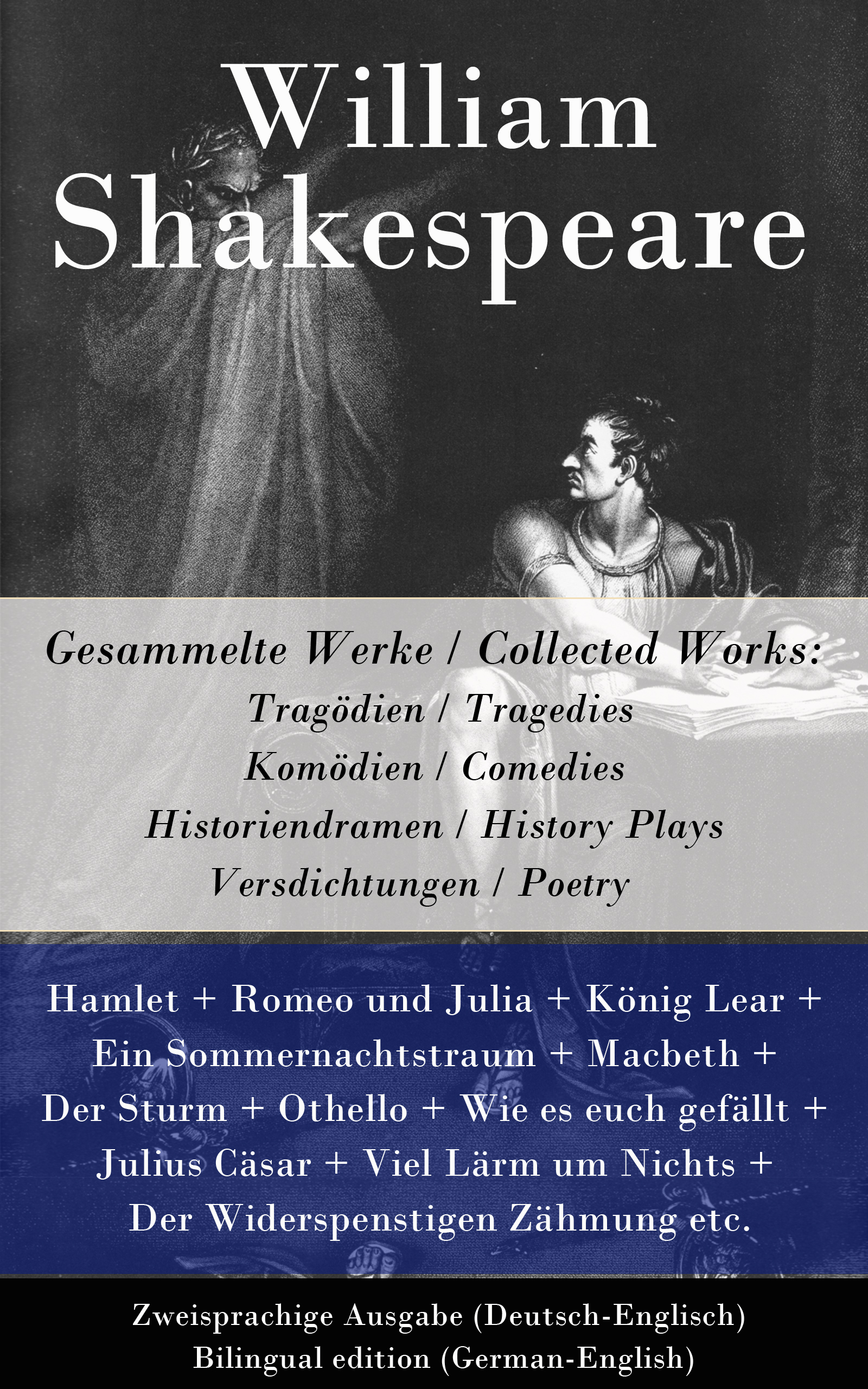 This carefully crafted ebook: "Gesammelte Werke / Collected Works: Tragödien / Tragedies + Komödien / Comedies + Historiendramen / History Plays + Versdichtungen / Poetry - Zweisprachige Ausgabe (Deutsch-Englisch) / Bilingual edition (German-English)" is formatted for your eReader with a functional and detailed table of contents. This bilingual Shakespeare edition helps the reader to understand and to interpret Shakespeare better, is practical for looking up text passages and very useful for learning and teaching german / english language through classic literature.