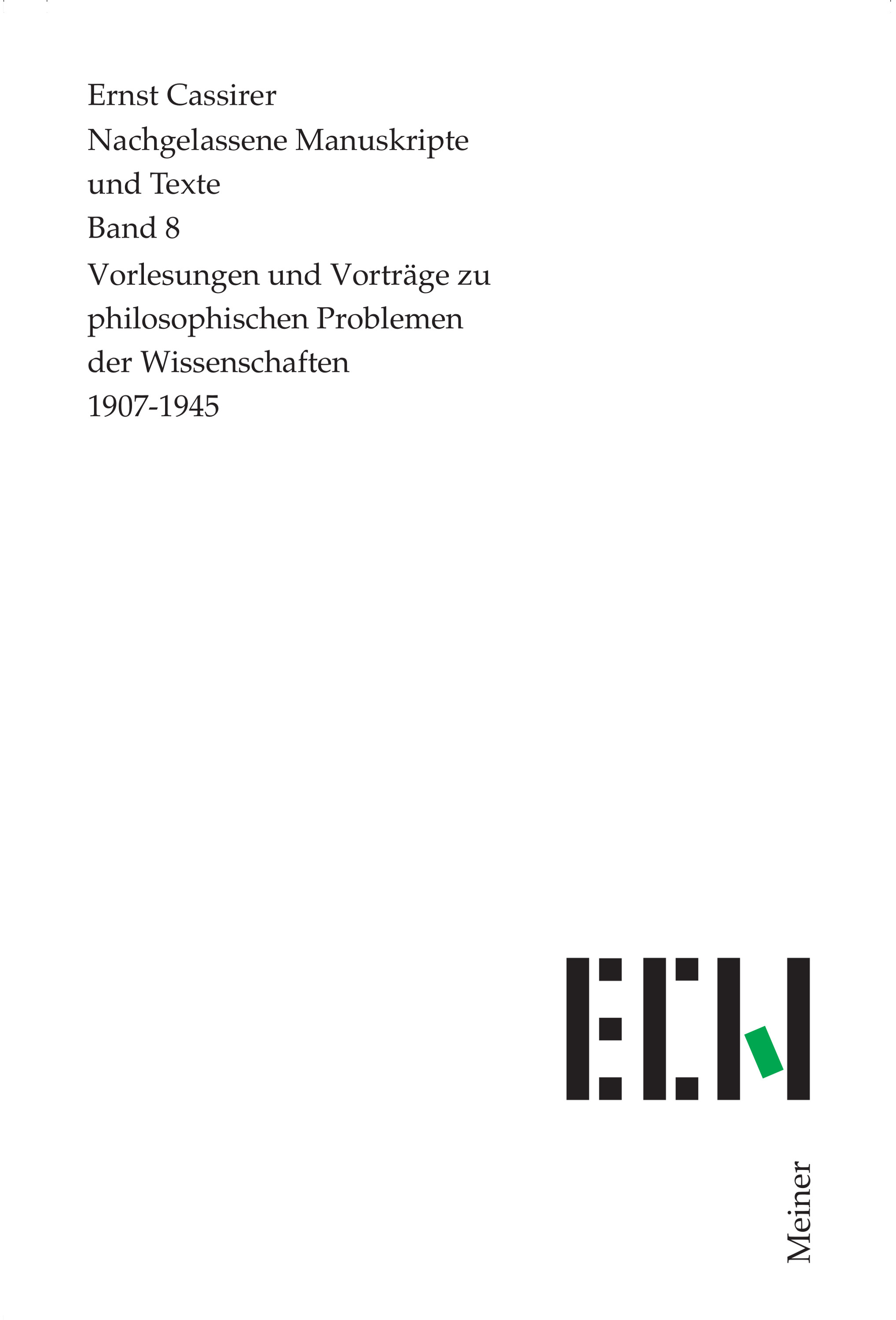 Band 8 der Edition »Nachgelassene Manuskripte und Texte« enthält neben dem frühen Vortrag aus Cassirers Berliner Zeit »Substanzbegriff und Funktionsbegriff« (1907) die Antrittsvorlesung in Hamburg »Die Beziehung zwischen Philosophie und exakter Wissenschaft« (1919) und den Hamburger Vorlesungszyklus »Die philosophischen Probleme der Relativitätstheorie« (1920/21). Außerdem enthalten sind zwei Radio-Vorträge zum Thema »Die Einheit der Wissenschaft« (21. und 28. Oktober 1931) und eine deutschsprachige sowie eine englischsprachige Studie zu »Gruppenbegriff und Wahrnehmungstheorie« (1937) und »The Concept of Group« (1945).