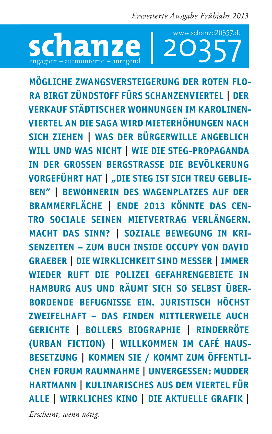 Die schanze 20357 ist ein unabhängig erstelltes Zeitungsprojekt aus Hamburg für Hamburg. Erscheint, wenn nötig.