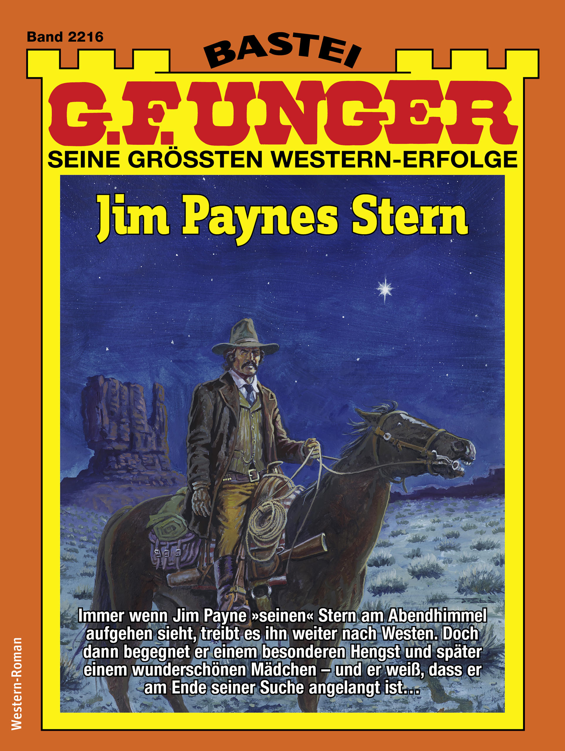Der Mond ist eine silberne Scheibe am Sternenhimmel. Jim Payne blickt nach Westen, und er scheint dort einen Stern zu betrachten, der klarer und schöner ist als alle anderen. Er leuchtet für Jim Payne irgendwie verheißungsvoll und lockend. Es ist der Stern, dem Jim Payne immer folgt, wenn er spürt, dass er reiten muss.